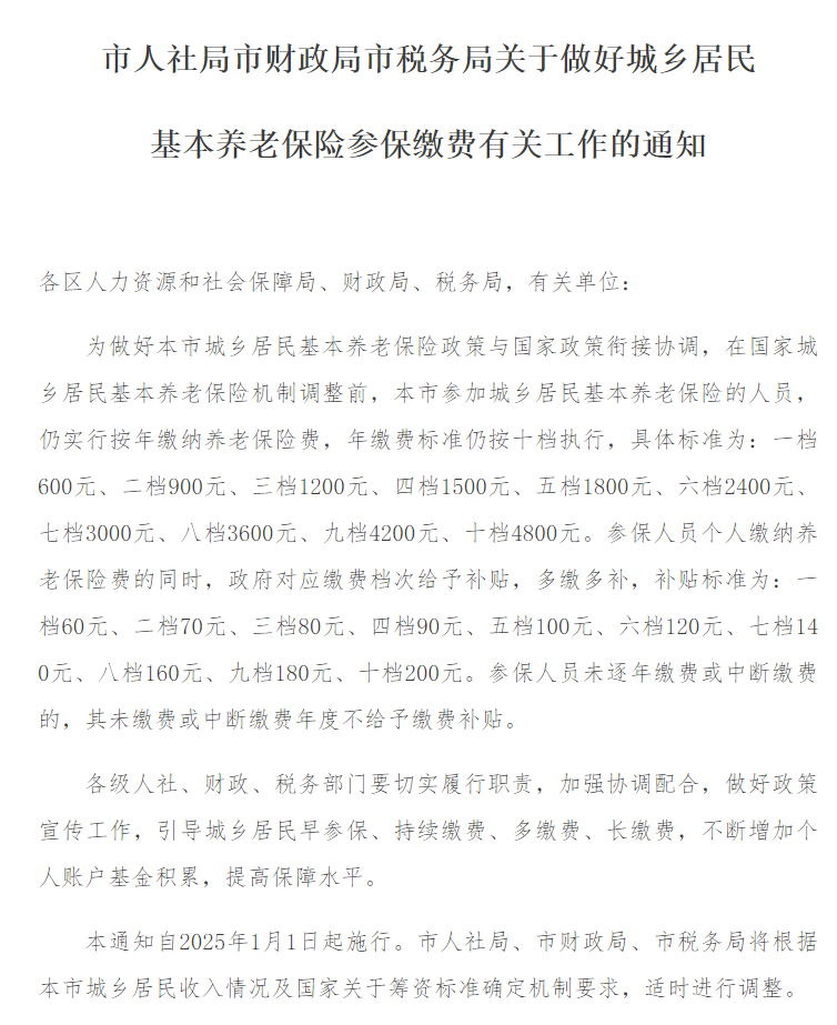 4月7日,天津市人力资源和社会保障局发布《市人社局市财政局市税务局关于做好城乡居民基本养老保险参保缴费有关工作的通知》,明确我市参加城乡居民基本养老保险的人员,仍实行按年缴纳养老保险费。
