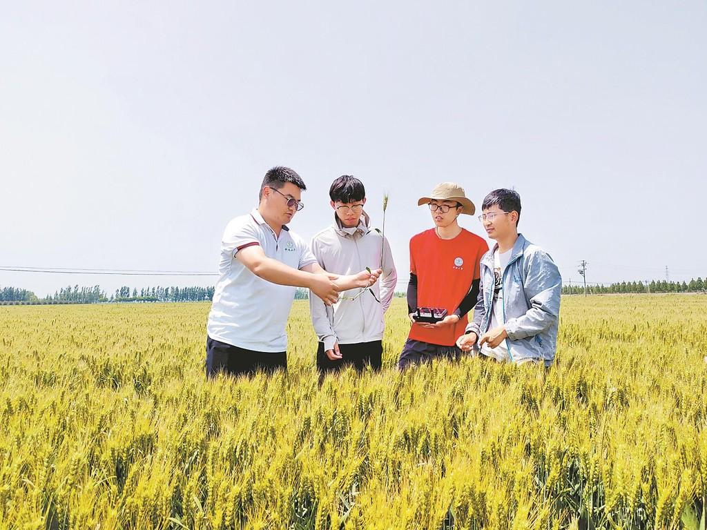 2024年6月,在曲周县王庄村“绿色吨半粮”试验田,叶松林(左一)、郝展宏(右一)和王庄科技小院的学生一起察看小麦长势。河北日报记者王璐丹摄