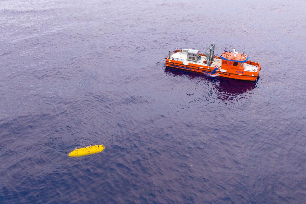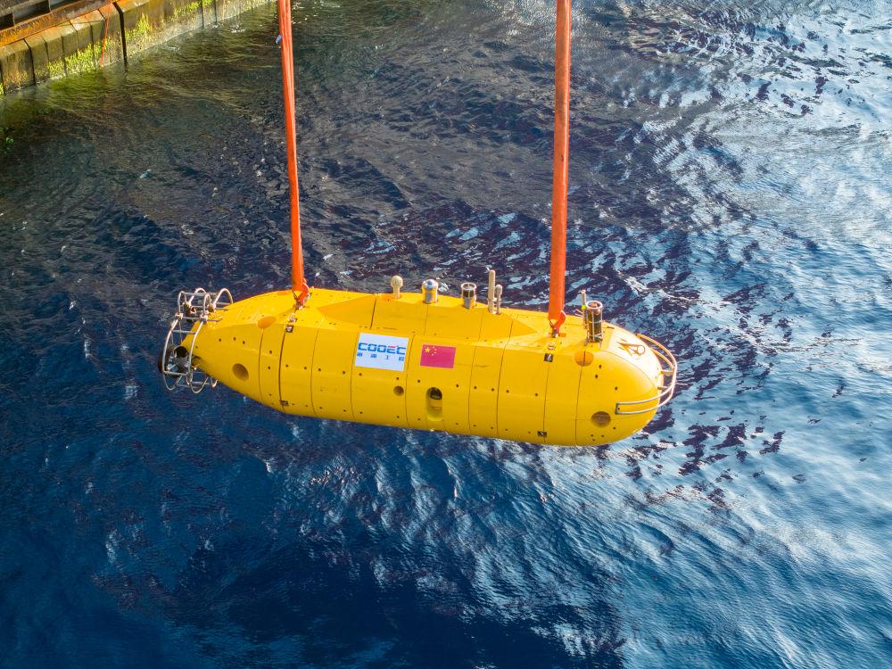 我国自主研发深水海管铺设智能监测装备“海卫”系统水下自主遥控机器人进行入海测试。(海油工程供图)