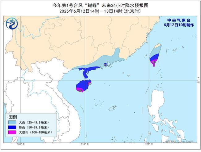降水预报:6月12日14时至13日14时,广西南部、广东中南部、海南岛、台湾岛大部、西沙群岛有大雨或暴雨,其中,海南岛西南部和东部、台湾岛南部局地有大暴雨(100-180毫米)。