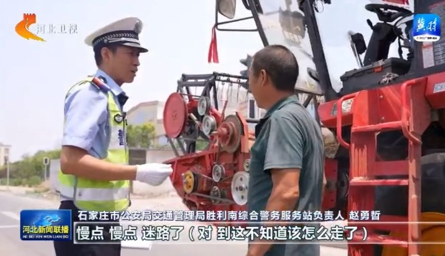 这名来自元氏县的农机手要去附近村里收割,但因为路不熟,开上了胜利南大街。交警立即组织警力为农机开道,把农机手一直带到了收割点。