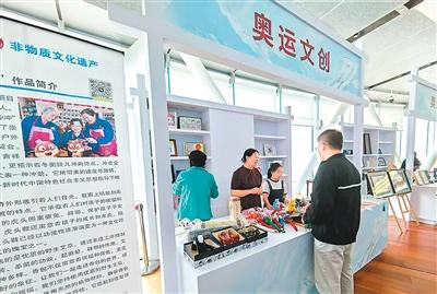设在张家口市崇礼区国家跳台滑雪中心内的非遗手工艺品展台。