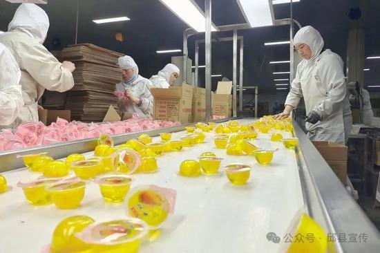 走进邱县经济开发区康贝尔食品生产车间,空气中弥漫丝丝香甜,糖坯从模具中脱出,塑成橙亮的橘瓣。在其他生产线上,果冻与软糖晶莹Q弹。
