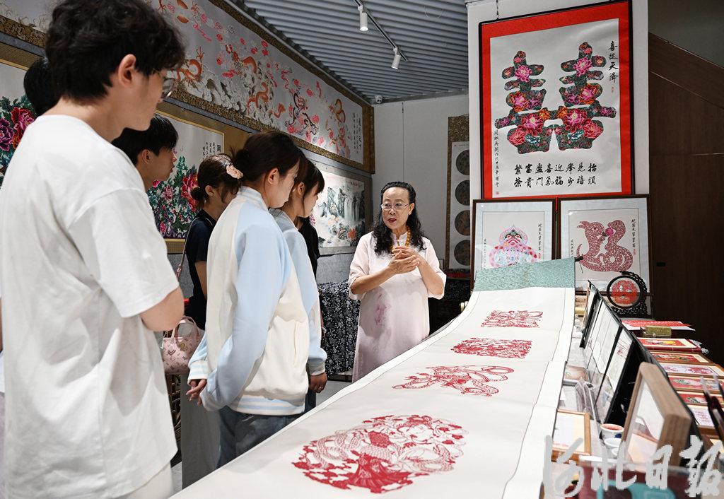 近日,国家级非遗代表性项目蔚县剪纸代表性传承人周淑英(右)在石家庄湾里庙步行街周淑英剪纸工作室为河北科技大学学生讲解剪纸技艺。河北日报记者 史晟全摄