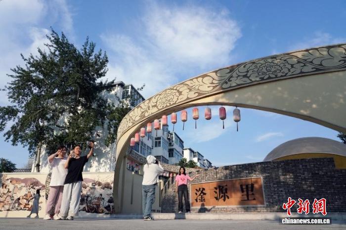 8月19日,游客在峰峰矿区滏源里磁州窑文化创意街区打卡留念。 李栋 摄