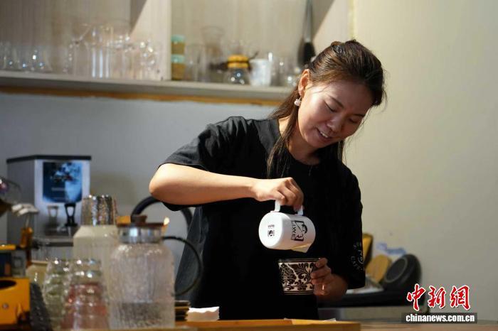 8月19日,陈钰淇咖啡店的工作人员用磁州窑系列咖啡杯为顾客制作咖啡。 李栋 摄