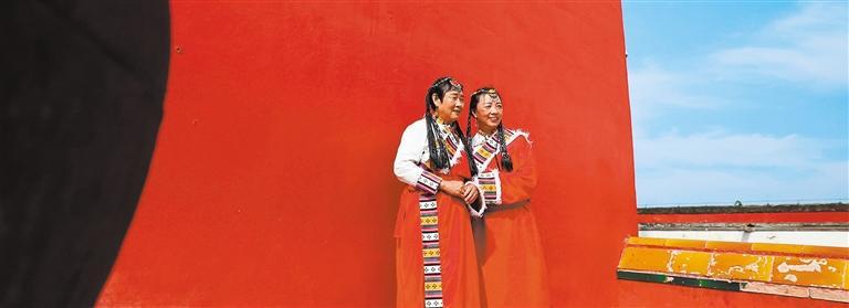 8月16日,游客身着民族服饰在承德普陀宗乘之庙拍照。