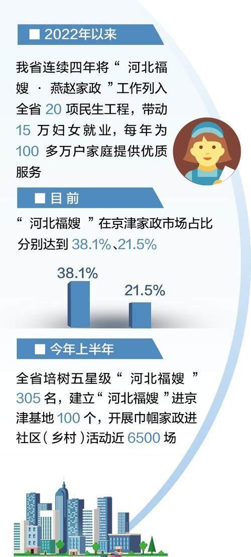 紧盯市场需求,变劳动力资源为发展优势。河北连续四年将“河北福嫂·燕赵家政”工作列入全省20项民生工程。今年上半年,我省选树五星级“河北福嫂”305名,建立“河北福嫂”进京津基地100个,开展巾帼家政进社区(乡村)活动近6500场。