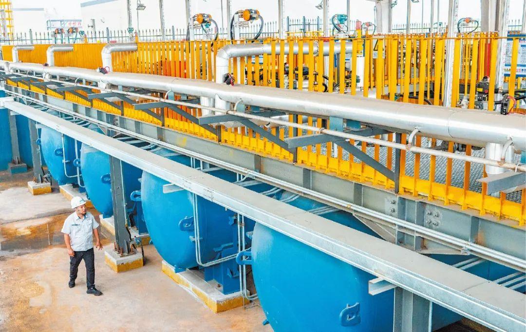 几分钟后,在虹吸井的牵引下,海水顺着地下管网奔涌至申港公司,经淡化装置过滤,摇身一变成为供给园区企业的淡化海水。