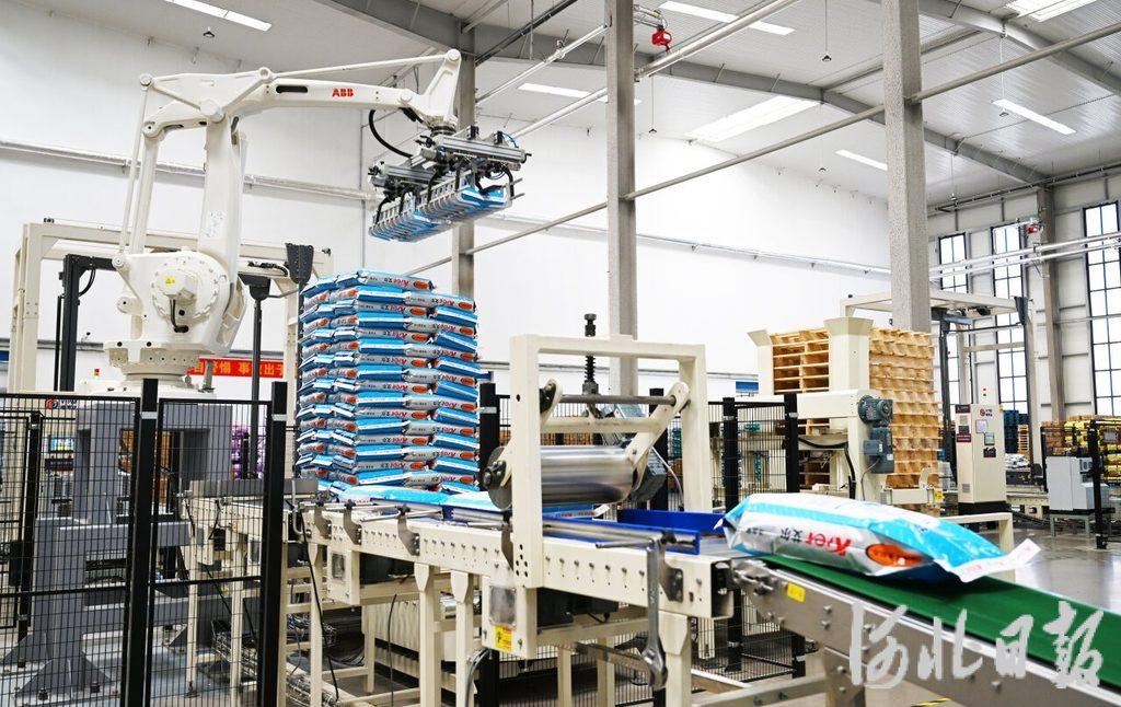 近日,在邢台市南和区荣喜宠物食品有限公司,码垛机器人在流水线上作业。河北日报记者 赵永辉摄