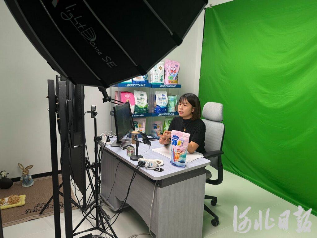 8月8日,在邢台市南和区华兴宠物食品有限公司的一间直播间内,主播正在直播。河北日报记者 常方圆摄