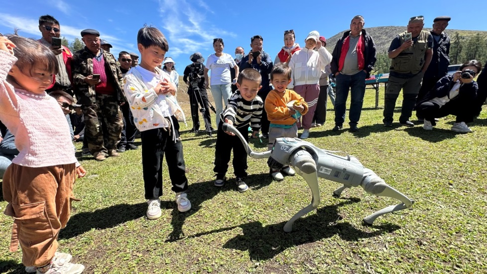 科普大篷车开进新疆阿勒泰青河县套查干湖夏牧场,当地小朋友和机器狗互动。(新疆科技馆供图)