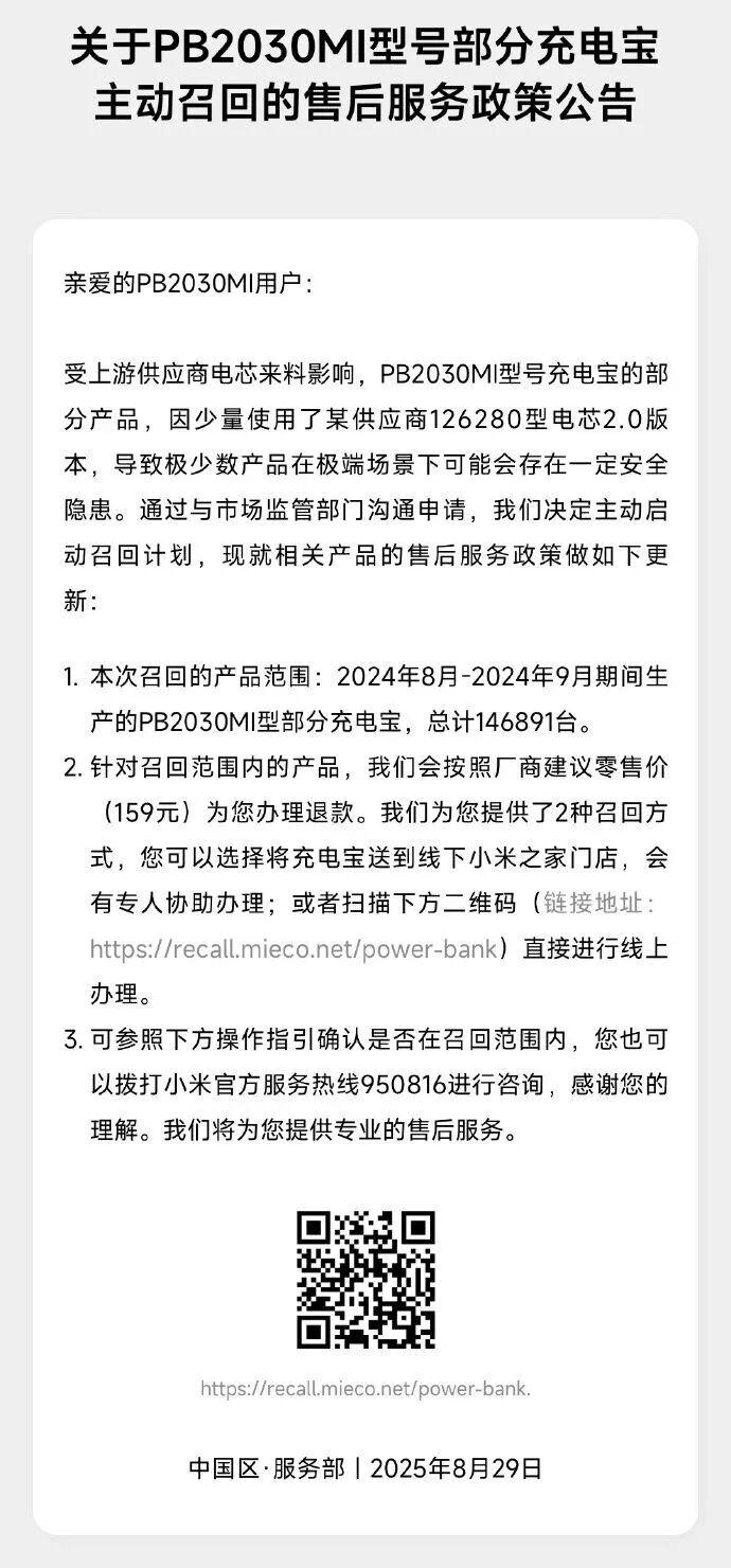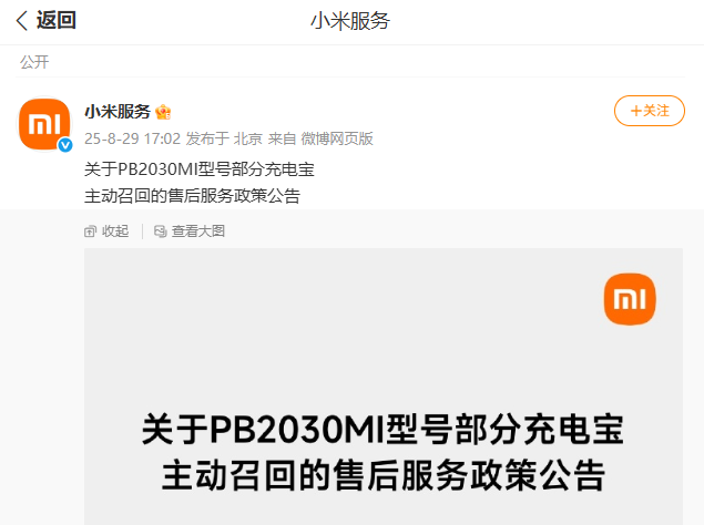 8月29日,小米服务官方微博发布关于PB2030MI型号部分充电宝主动召回的售后服务政策公告。