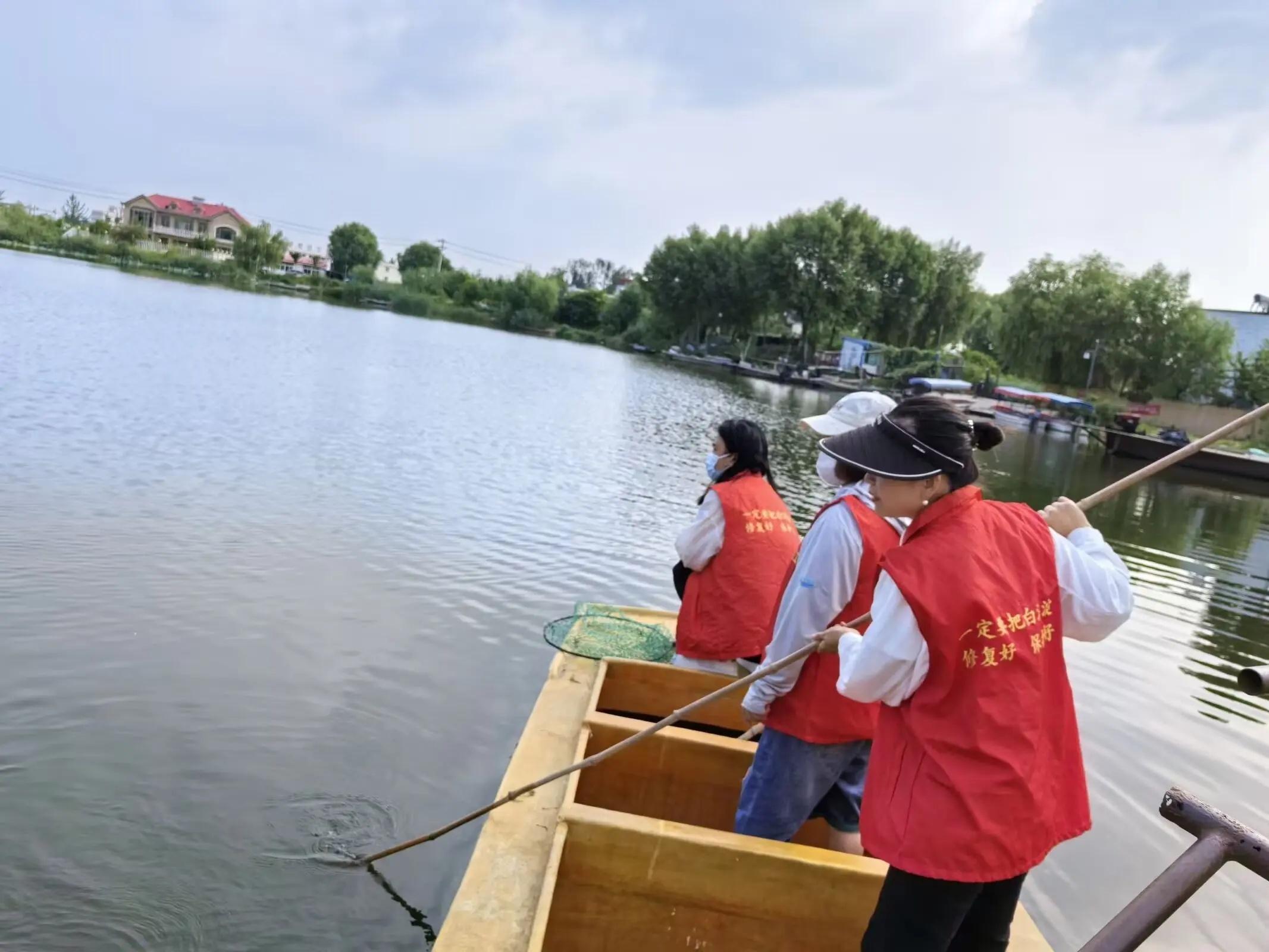 清晨五点,获得全国“最美河湖卫士”称号的安新县圈头乡志愿服务队队员陈雪飞,已经划着小船出了门。她穿着蓝布衫,裤脚卷到膝盖,像极了《荷花淀》里的水生嫂。