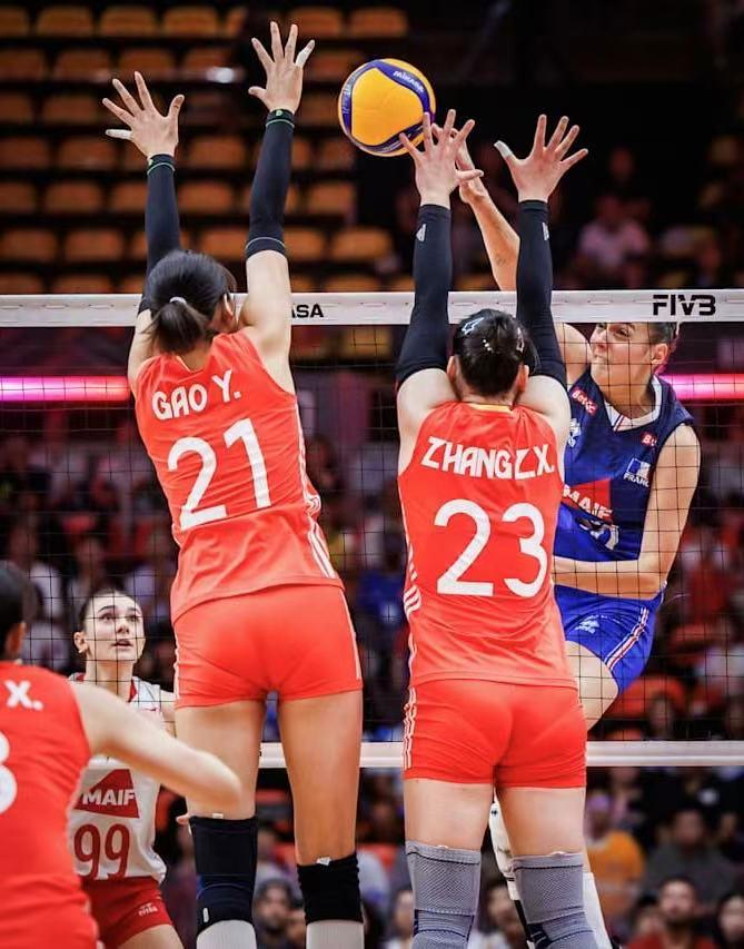 第三局,中国女排重整旗鼓,以19:13领先。尽管法国队随后竭力追赶,但中国姑娘稳住阵脚,以25:22扳回一局,大比分1:2。