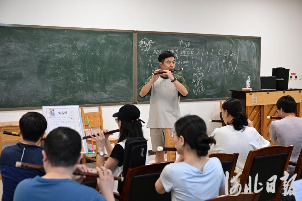 近日,河北省群艺馆青年夜校老师在教学员吹奏笛子。河北日报记者 史晟全 摄