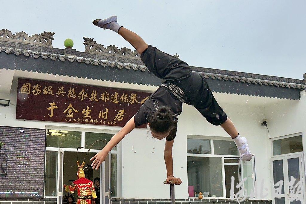 “嘿!起!”9月5日下午,蒙蒙烟雨中,在吴桥县于集镇于东村的于金生杂技小院里,11岁的李雲铜一丝不苟地练习着“单手倒立”。只见她靠一只手支撑起整个身体的重量,侧腰上顶、慢慢地举起双腿、劈开、收拢,悬空变幻出各种高难而优美的姿势。