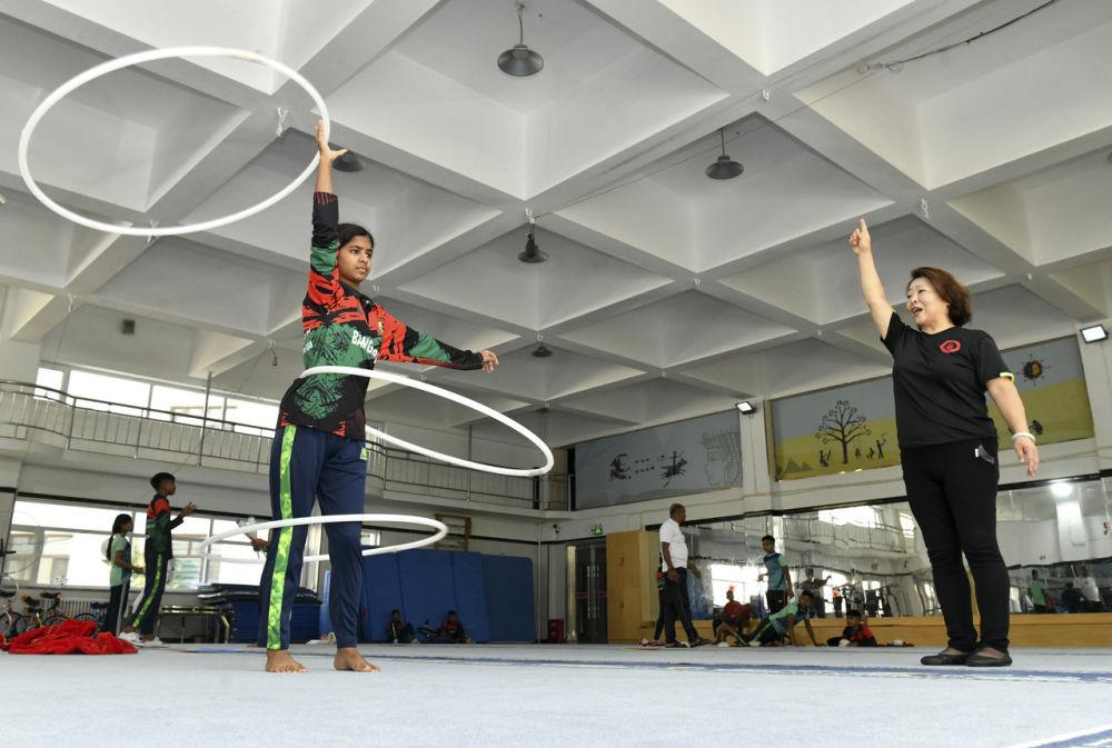 8月20日,来自孟加拉国的学员在河北吴桥杂技艺术学校排练厅内练习杂技。新华每日电讯记者 牟宇 摄