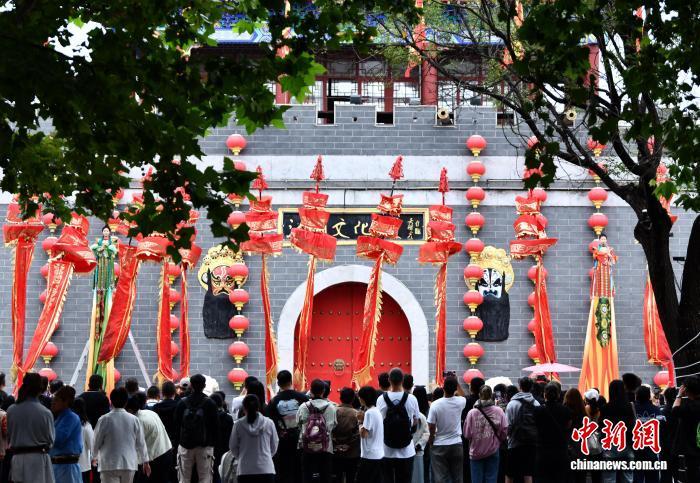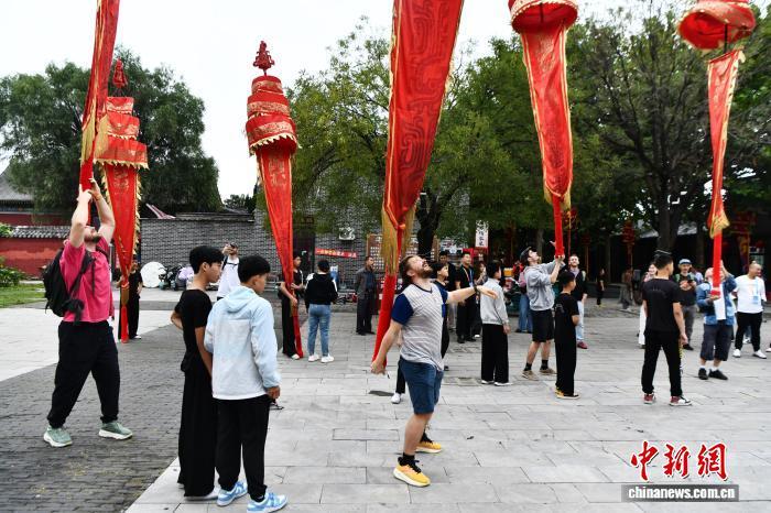 9月27日,在吴桥杂技大世界江湖文化城门口,外国游客体验中幡。第二十届中国吴桥国际杂技艺术节举办前夕,河北省吴桥县吴桥杂技大世界内游客络绎不绝,表演者的“绝活”赢得阵阵掌声。中新社记者 翟羽佳 摄