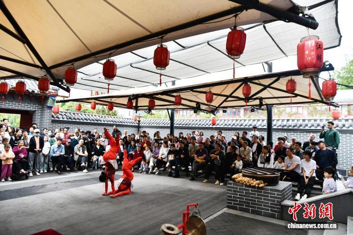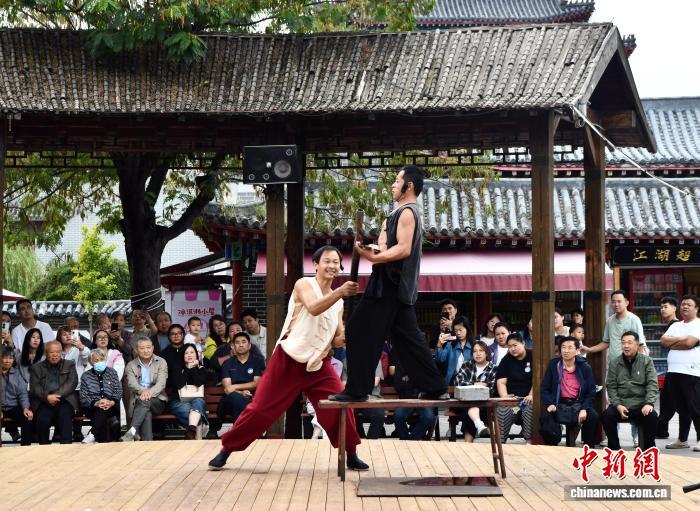 9月27日,杂技艺人在吴桥杂技大世界江湖文化城内献艺。第二十届中国吴桥国际杂技艺术节举办前夕,河北省吴桥县吴桥杂技大世界内游客络绎不绝,表演者的“绝活”赢得阵阵掌声。中新社记者 翟羽佳 摄