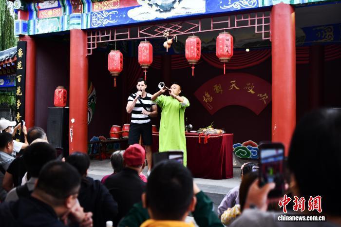 9月27日,杂技艺人在吴桥杂技大世界江湖文化城门口献艺。第二十届中国吴桥国际杂技艺术节举办前夕,河北省吴桥县吴桥杂技大世界内游客络绎不绝,表演者的“绝活”赢得阵阵掌声。中新社记者 翟羽佳 摄