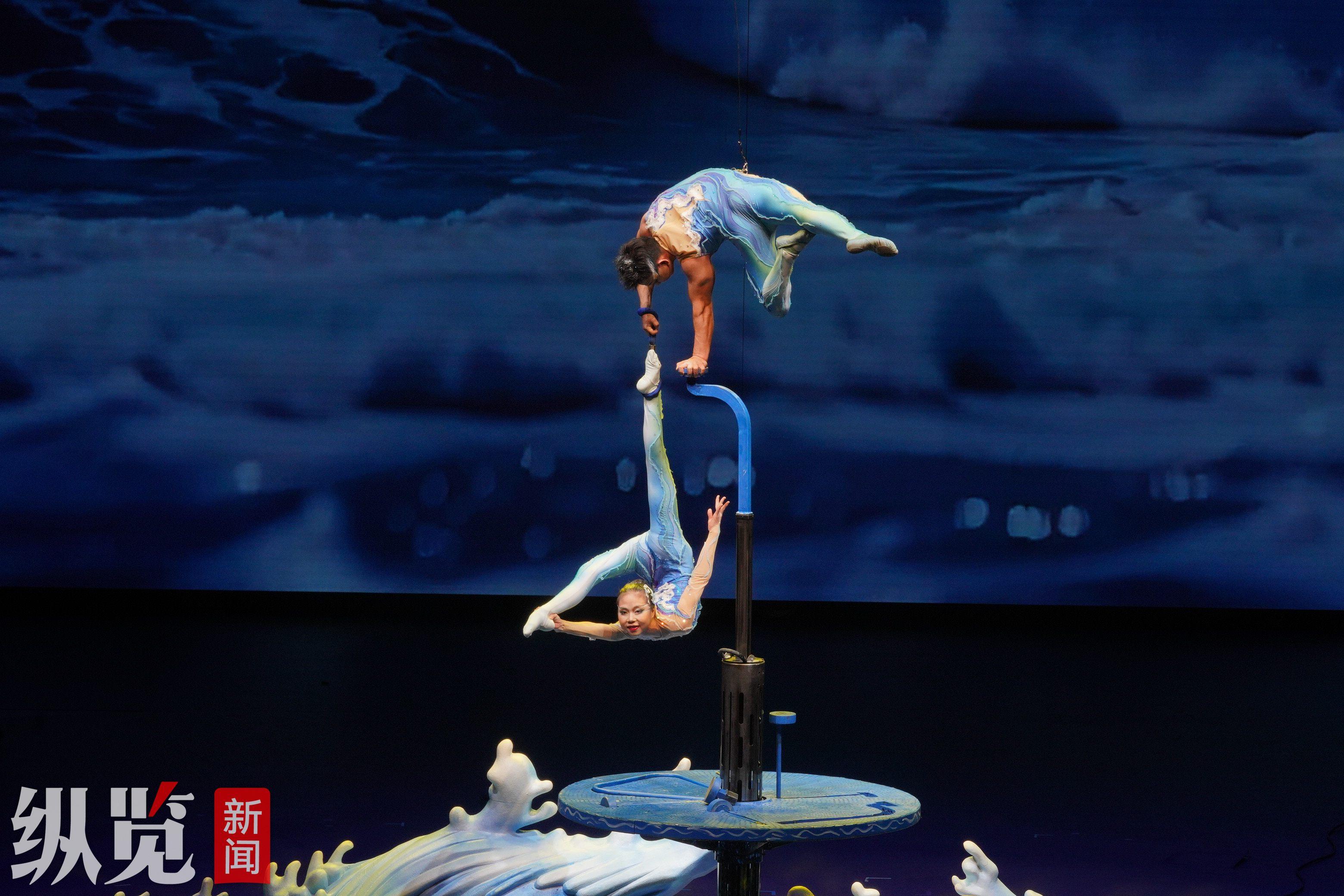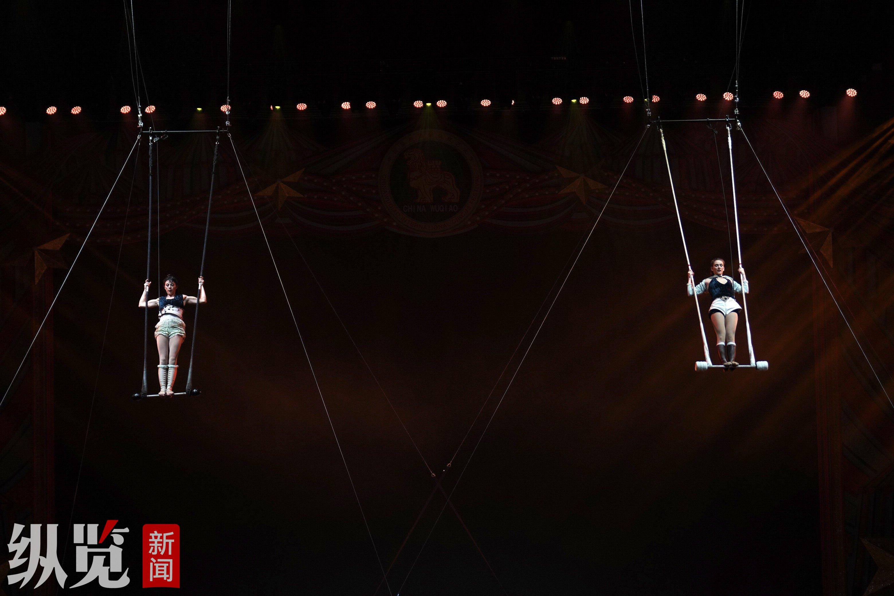 舞台灯光亮起,两名法国女演员站在数米高的秋千上摇晃起来,并做出旋转、空翻等各种高难度的动作,惊险又优美,让观众的目光紧紧追随,不时发出惊叹。