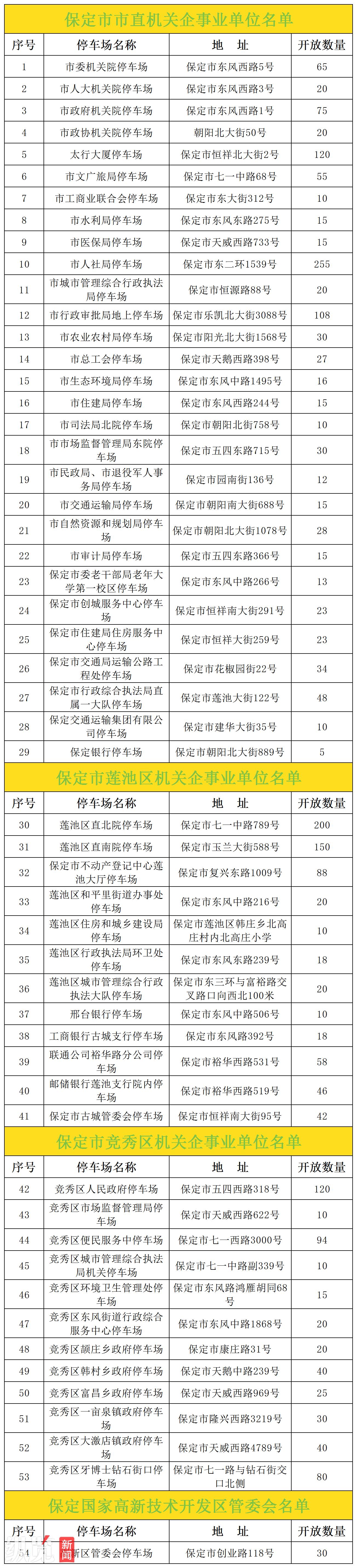 保定市主城区机关企事业单位免费开放停车位名单。(来源/保定文旅)
