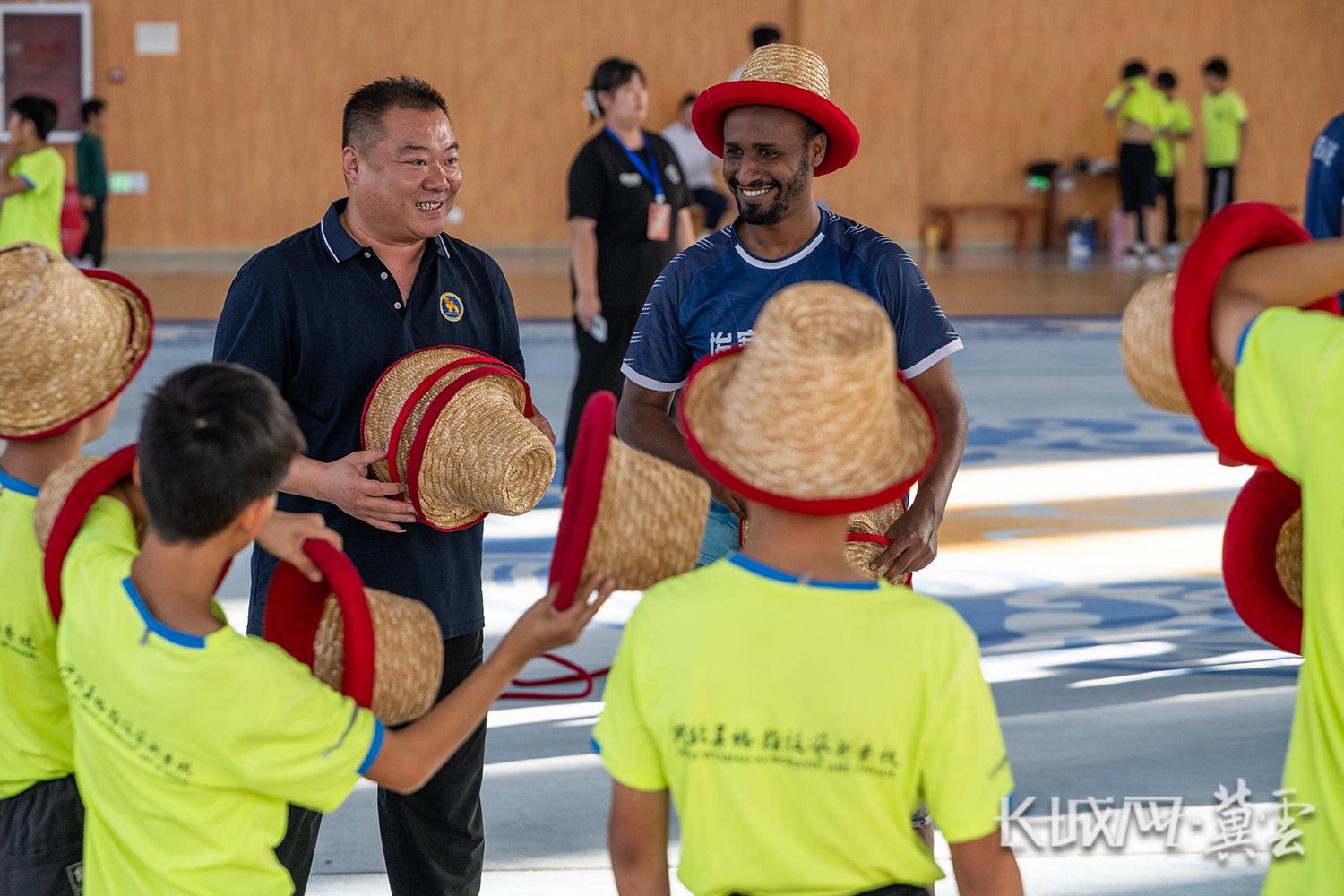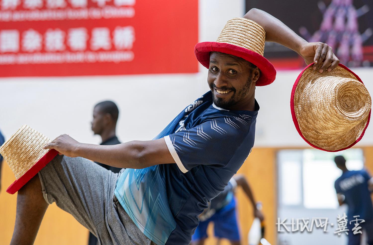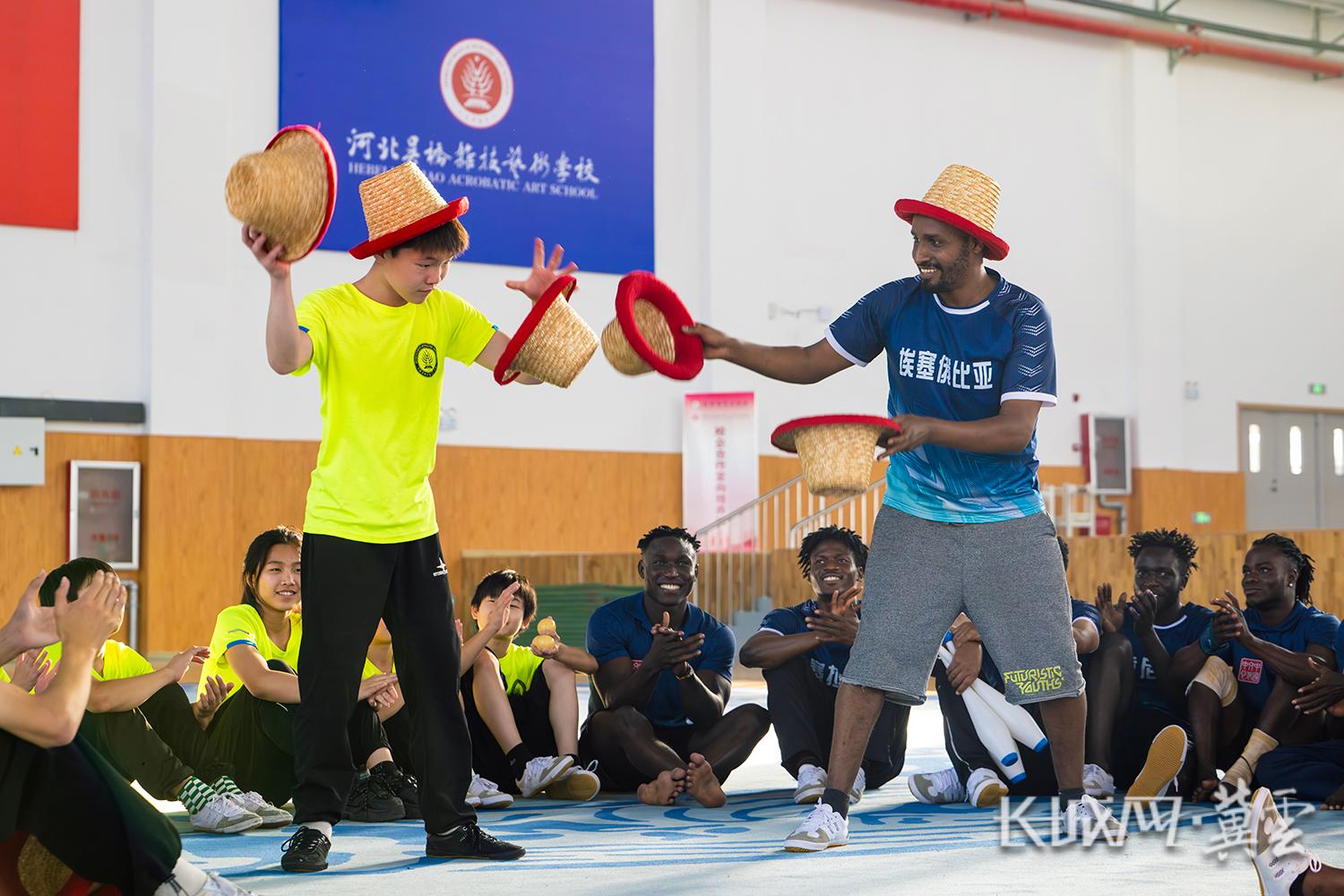 徐洋老师(左)传授草帽技巧,来自埃塞俄比亚的Tsegaye(右)和小学员们听得兴致盎然,感受杂技的魅力。长城网·冀云客户端记者 许付磊 摄
