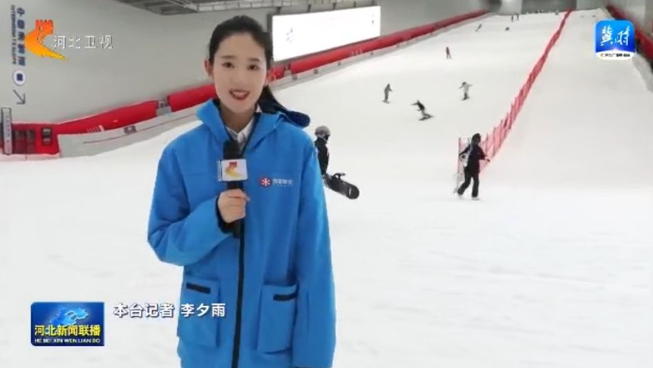 我现在是在我国华北地区最大的四季恒温室内滑雪场之一 —— 正定热雪奇迹滑雪场。大家可以看到在我身后的初级滑道和中级滑道,滑雪高手们从高处风驰电掣般滑下,非常的过瘾。