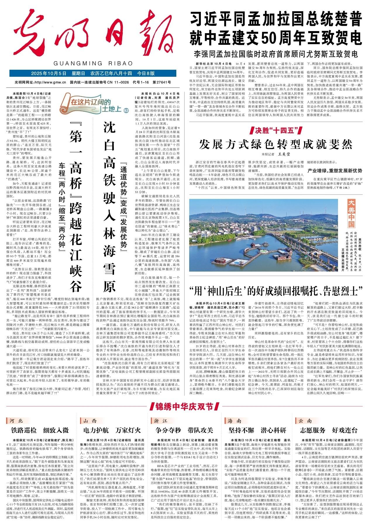 光明日报保定10月4日电(记者 耿建扩 陈元秋)4日,京广高铁河北保定段,列车每隔一两分钟疾驰而过。铁路线旁的输电铁塔下,两个身穿绿色工装的身影专注工作着。