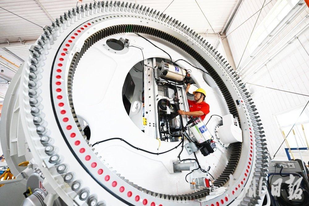 8月25日,位于邢台经济开发区的邢台金风科技有限公司,工人在装配车间组装风力发电机组叶轮。赵永辉 李院红摄