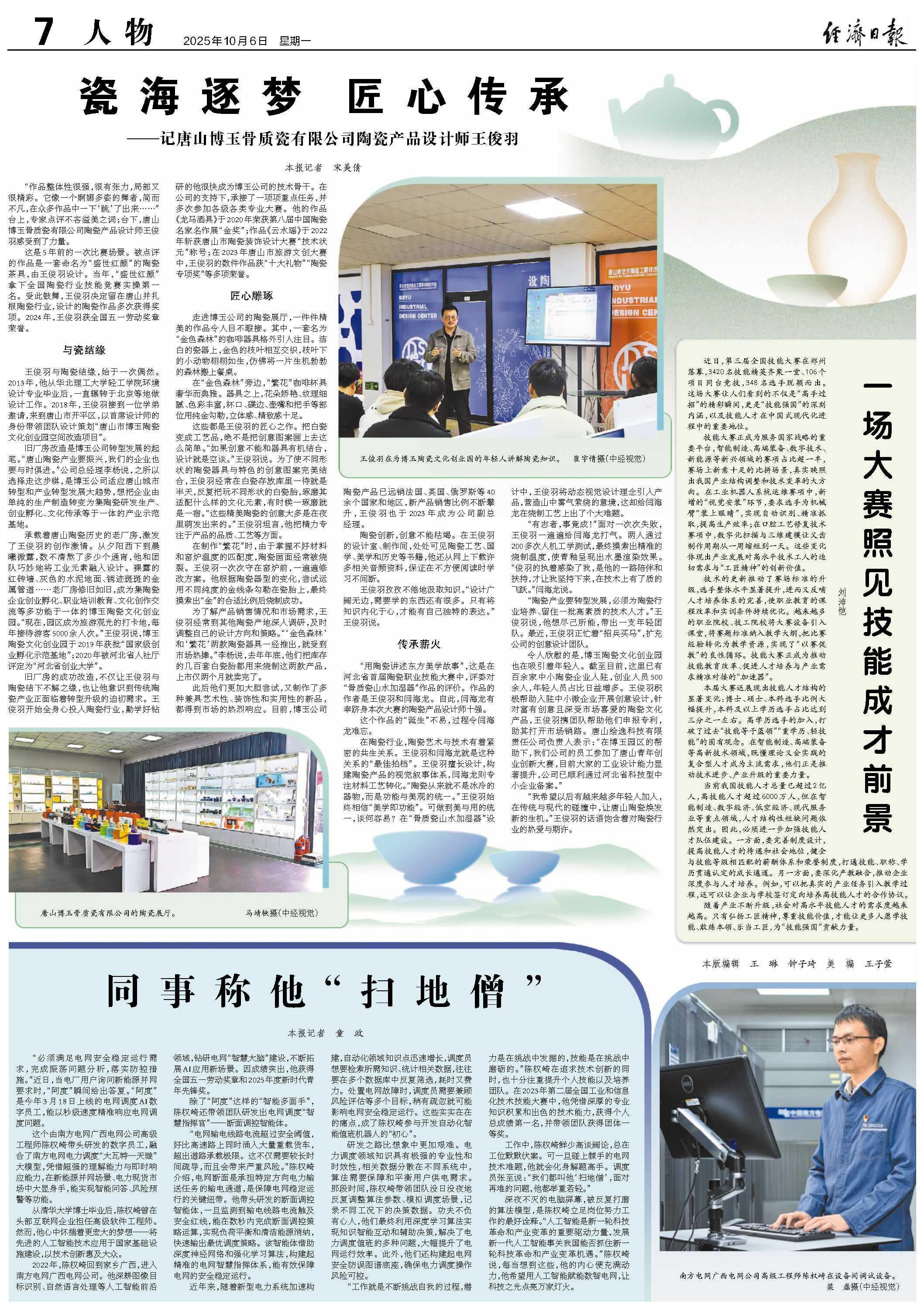 这是5年前的一次比赛场景。被点评的作品是一套命名为“盛世红颜”的陶瓷茶具,由王俊羽设计。当年,“盛世红颜”拿下全国陶瓷行业技能竞赛实操第一名。受此鼓舞,王俊羽决定留在唐山并扎根陶瓷行业,设计的陶瓷作品多次获得奖项。2024年,王俊羽获全国五一劳动奖章荣誉。