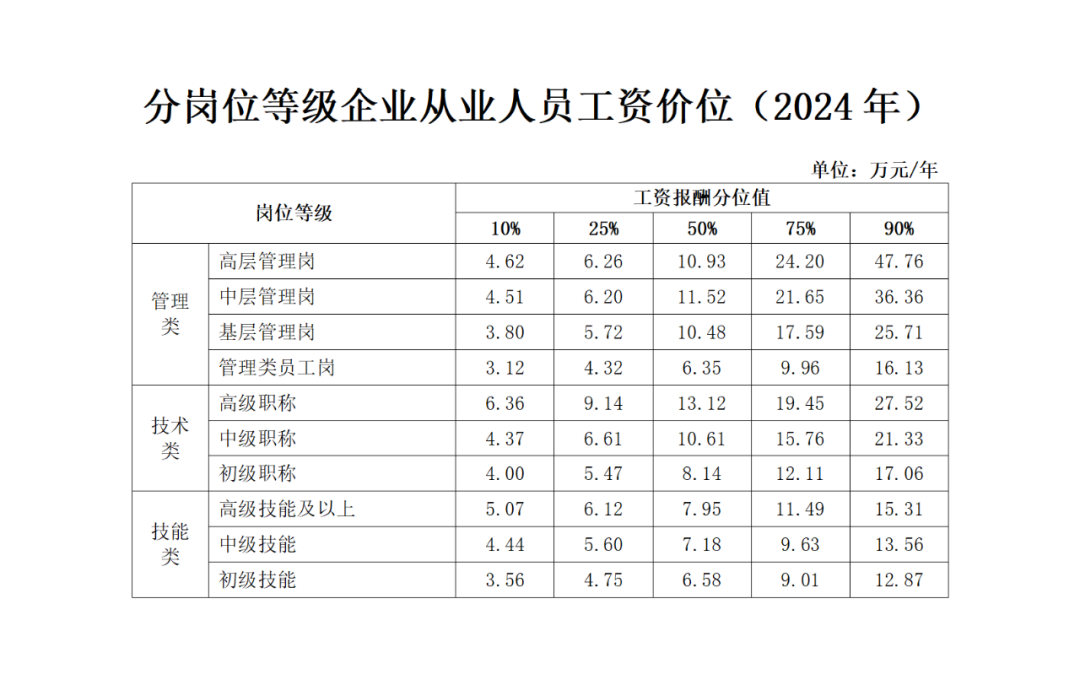 工资价位 是指企业从业人员在报告期内的工资水平,包括基本工资、奖金、津贴和补贴、加班加点工资和特殊情况下支付的工资等,在一定程度上体现了劳动力市场价格水平,以分位值形式呈现,主要包括:10%(低位数)、25%(下四分位数)、50%(中位数)、75%(上四分位数)、90%(高位数)。
