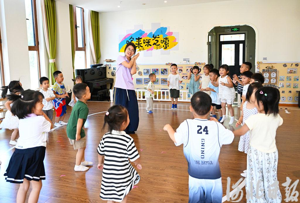 7月4日,邢台市南和区小博士第三幼儿园托育班,保育师带领孩子们做游戏。河北日报记者 赵永辉 摄