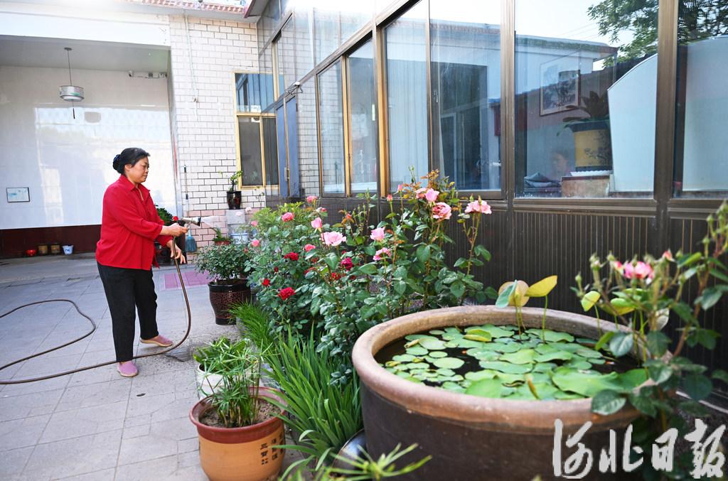 4月29日,宁晋县魏家庄村村民张春联在春意盎然的庭院里管护鲜花。河北日报记者 赵永辉 摄
