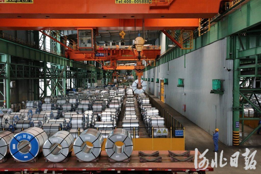 在首钢京唐钢铁联合有限责任公司冷轧作业部高强镀锌板成品库,运用大废钢比冶炼技术生产的钢卷正等待装车。河北日报记者 王育民 摄