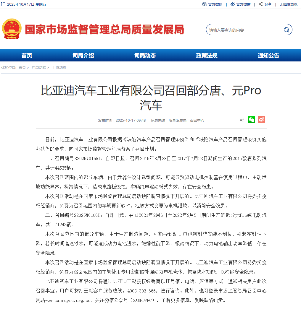 一、召回编号S2025M0165I:自即日起,召回2015年3月28日至2017年7月28日期间生产的2015款唐系列汽车,共计44535辆。