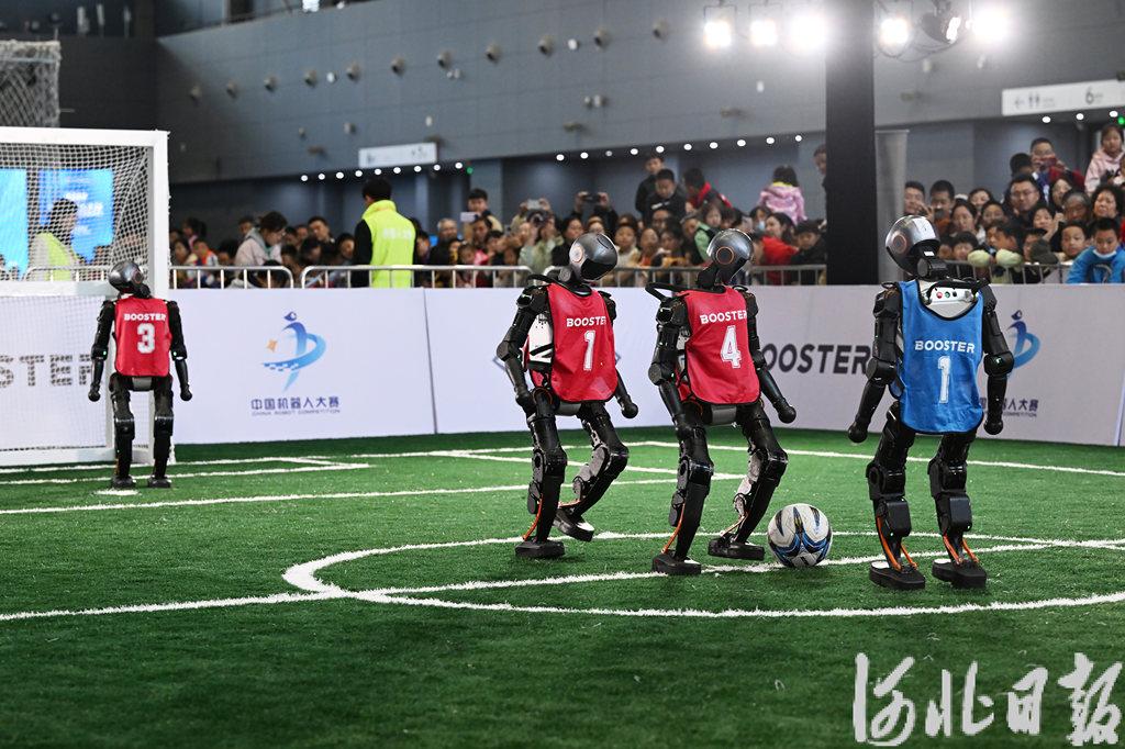 10月18日,3V3足球赛场上,人形机器人“球员”正在比赛。河北日报记者 史晟全 摄