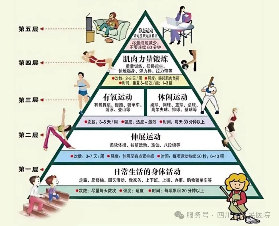 第一层:日常活动。走路、爬楼梯、园艺活动、做家务、上下班、上街、办事、购物骑单车等。日常活动有助对抗久坐、维持代谢、偷偷燃脂。建议每天数次,积少成多。利用一切机会动起来。