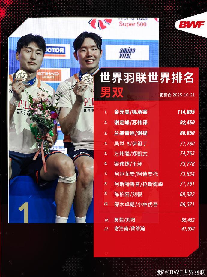 世界羽联2025年第43周世界排名揭晓,中国队强势包揽三项世界第一:石宇奇(男单)、刘圣书/谭宁(女双)、蒋振邦/魏雅欣(混双)均以10万+高分继续领跑各单项第一。