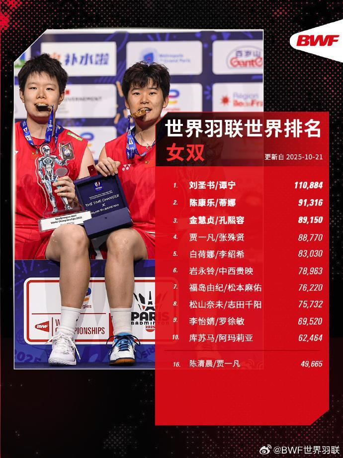 世界羽联最新世界排名揭晓 中国队包揽三项世界第一