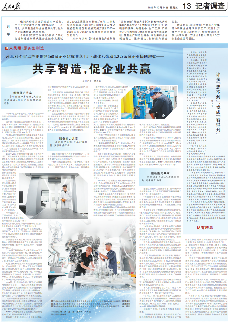 “制造能力、服务能力共享是实现产业集群量变的基础,创新能力共享则是推动产业集群质变的关键。”孟宪鹏认为,“共享智造”不止于构筑资源聚合的“成本洼地”,更致力于涵养创新共生的“科创高地”。如今,在河北不少地方,不仅研发设备共享,人才也开放流动、协同攻关。