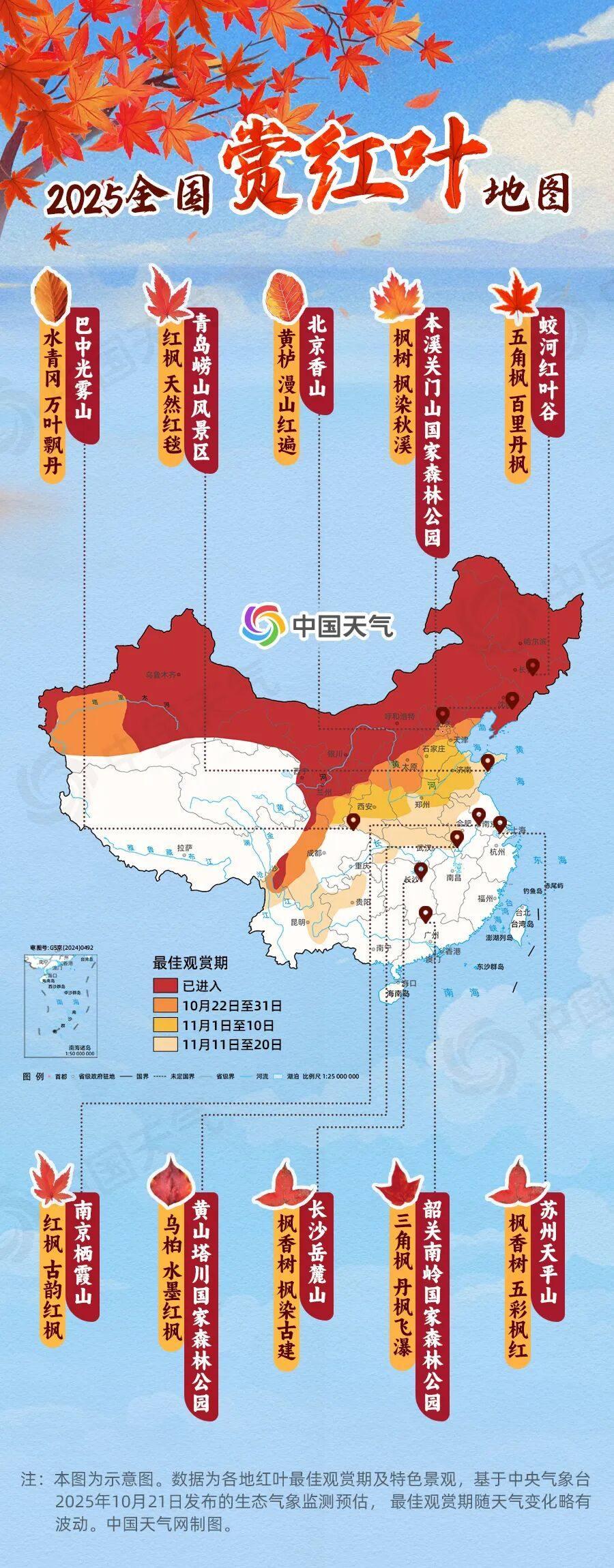 “停车坐爱枫林晚,霜叶红于二月花。” 时值霜降,我国长江以北地区秋意已浓,秋的前沿已抵达江南南部一带。随着气温走低,各地秋叶逐渐变色,赏红叶的最佳时节到了。中国天气网推出2025全国赏红叶地图,看看哪些地方即将进入最佳观赏期,还有十大赏红叶胜地的特色景观推荐,带你开启一场赏红之旅。
