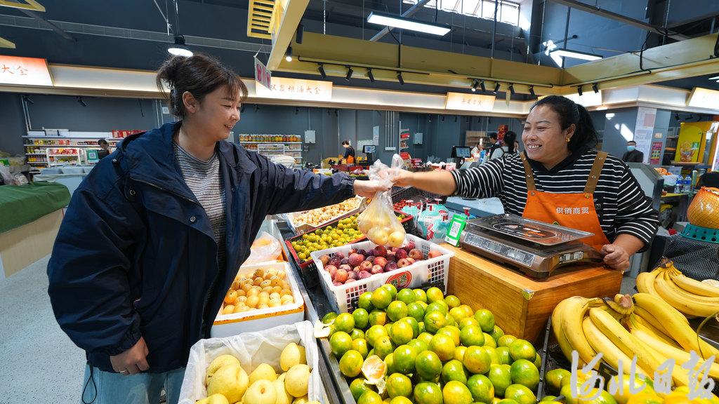 10月13日,在雄安大河便民市场,顾客(左)正在购买水果。河北日报见习记者 李畅 摄
