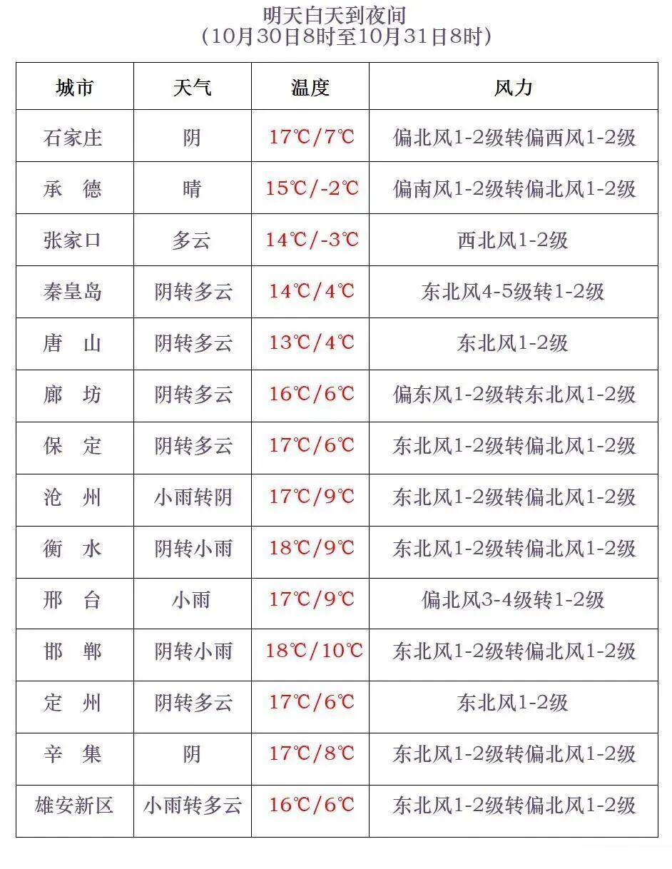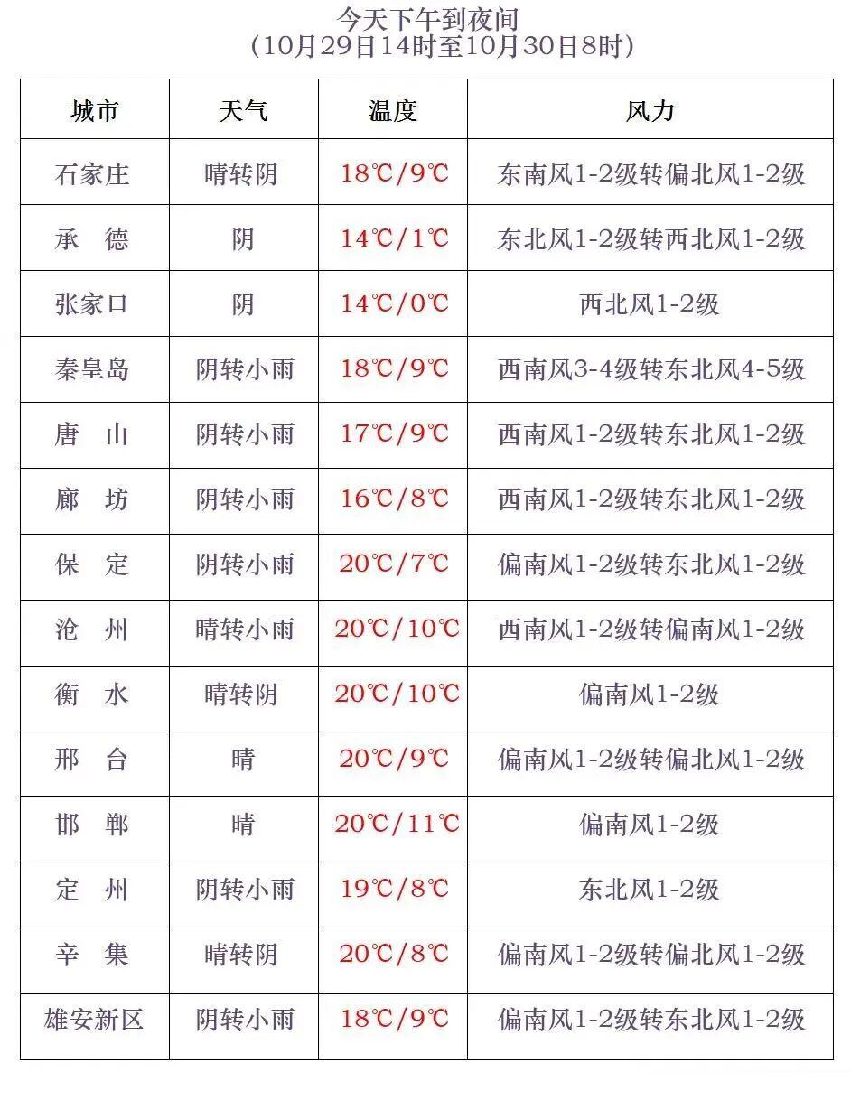 河北省气象台2025年10月29日11时发布天气预报: