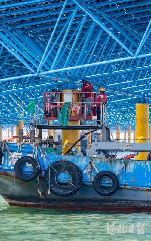 10月14日,晨光穿透薄雾,秦皇岛市昌黎县滦河口附近海域一片忙碌景象。打桩船、吊装船、运输船等30多艘船在海面穿梭,船身切开碧波的轨迹与100多组已安装的光伏网架构成壮阔图景。这里是河北华电昌黎50万千瓦海上光伏试点项目现场,我省首个海上光伏项目的蓝图在渤海徐徐展开。