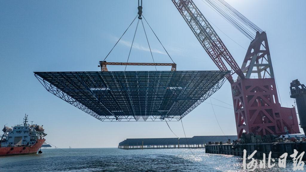 正午的阳光为光伏板镀上金边时,吊装作业进入关键窗口期。68米长、38.4米宽的光伏网架在“1主+4次”吊装设备牵引下升空,面积相当于6个标准篮球场的网架掠过海面,阴影在波峰浪谷间快速移动。“右边保持不动,左前抬高一些,左边再向前移。”施工指挥人员王久龙不断通过对讲机发出指令,吊塔司机根据指令转动控制杆,四根次吊装索链精准调整角度,将网架稳稳对接在4个不足0.2平方米的桩顶接口。