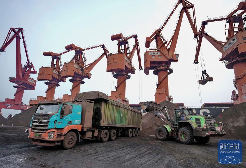 ↑ 10月28日,在唐山海港经济开发区唐山港京唐港区矿石码头,工人操作电动铲车往电动重卡上装货。