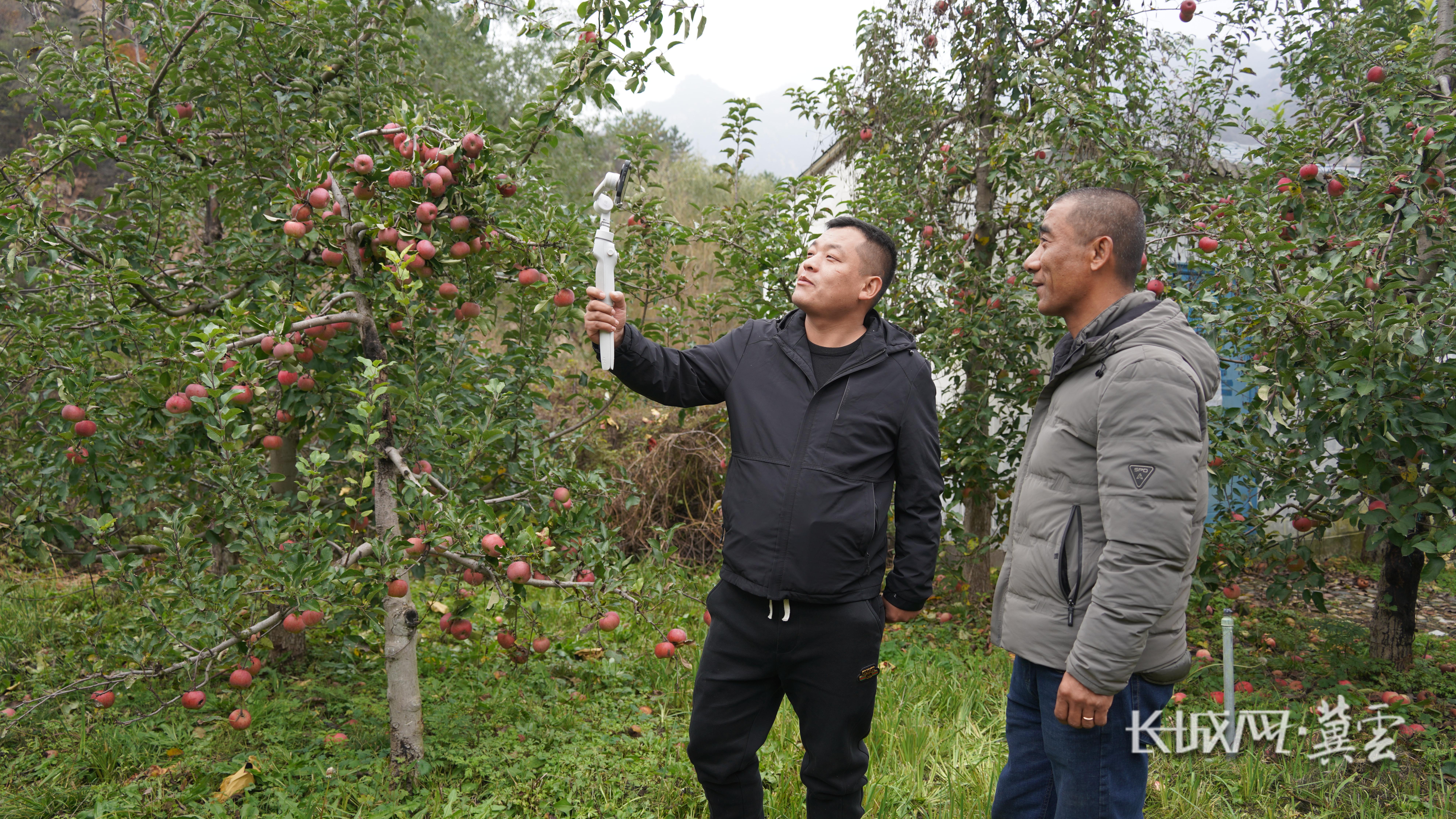 白龙(左)和韩永亮在果园直播。长城网·冀云客户端记者 熊庆 李雄飞 摄