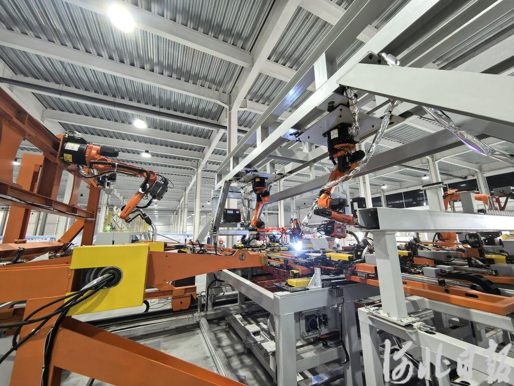 7月7日,安平县网都科技共享智造工厂内,全国首条铁路护栏网全自动焊接流水线正在进行焊接作业。河北日报记者 周聪聪 摄
